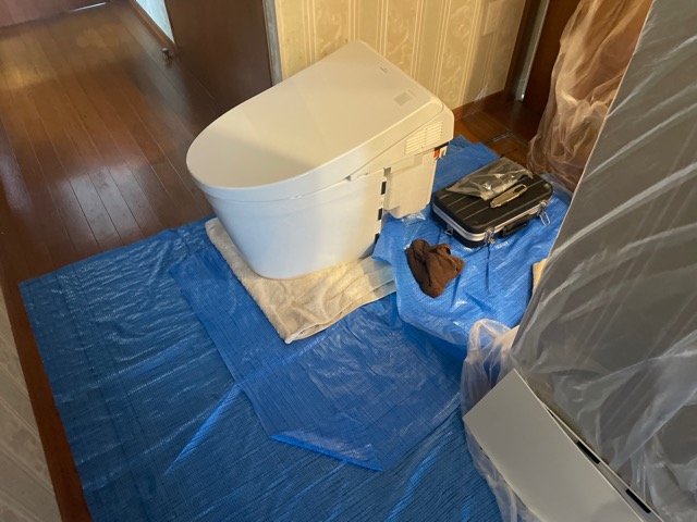 大便器を脱着し排水管内の高圧洗浄を行っております。