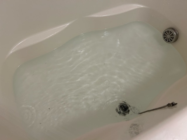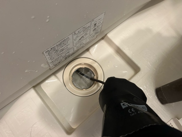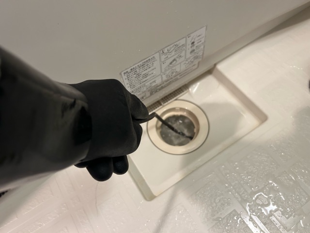 浴室排水の下流側と浴槽側を電動トーラー作業にて異物を除去しております。